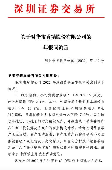 5月11日,华宝香精股份有限公司(以下简称“华宝股份”或“公司”)收到深圳证券交易所的年报问询函。问询函要求华宝股份量化分析从“销售香精产品”到“提供解决方案”的商业模式升级的具体内涵;说明公司营业收入增长幅度低于直接人工和制造费用增长幅度的原因;说明今年新增短期借款的必要性等。