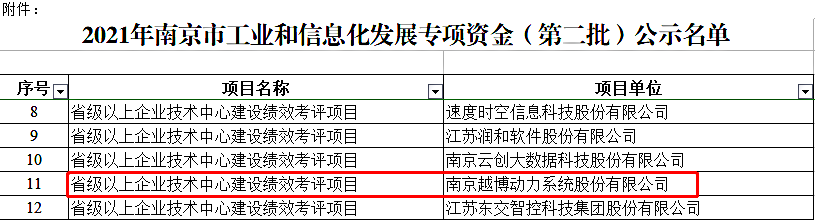 近日,南京市工业和信息化局发布了“2021年南京市工业和信息化发展专项资金(第二批)项目公示”。越博动力申报的“省级以上企业技术中心建设绩效考评项目”成功通过评审,纳入专项资金支持名单。