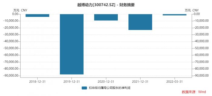 Wind数据显示,2018-2021年,越博动力的营业收入从4.93亿元跌至3.07亿元,归母净利润从0.21亿元变成亏损2.30亿元。并且,2018-2021年,越博动力的“扣非”归母净利润均为负数,这意味着其主营业务的盈利能力已经非常差了。