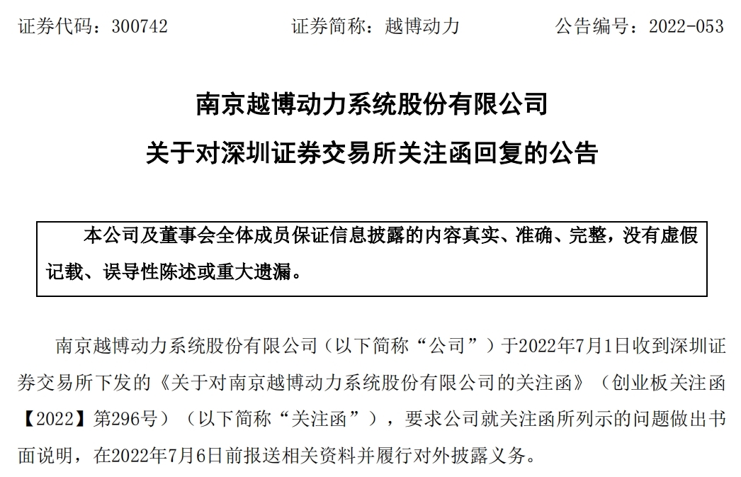 近日,汽车动力总成供应商越博动力(SZ300742,股价15.75元,市值22亿元)成立新能源子公司的议案引发了深交所的监管关注。