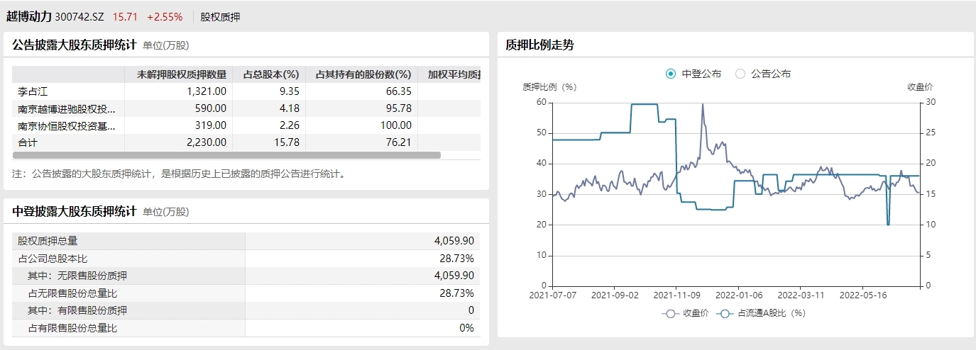Wind数据显示,李占江及其实控的两家子公司作为越博动力的大股东,均对越博动力的持股股权进行了巨额质押,三个大股东合计质押股权为2230万股,占三方合计持股的76.21%,占越博动力总股本的15.78%,其中李占江质押的股权为1321万股,占其所持股权的66.35%,占越博动力总股本的9.35%。