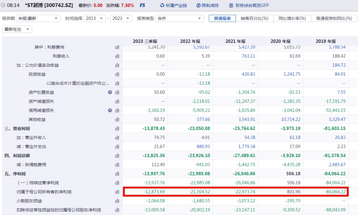 业绩方面,*ST越博2019年开始净利润出现亏损,当年净亏8.41亿元,2020年净利润短暂回正为801.96万元,2021年、2022年净利润分别亏损2.30亿元、2.13亿元。2023年前三季度,公司持续亏损,到三季度末净资产已为负数。