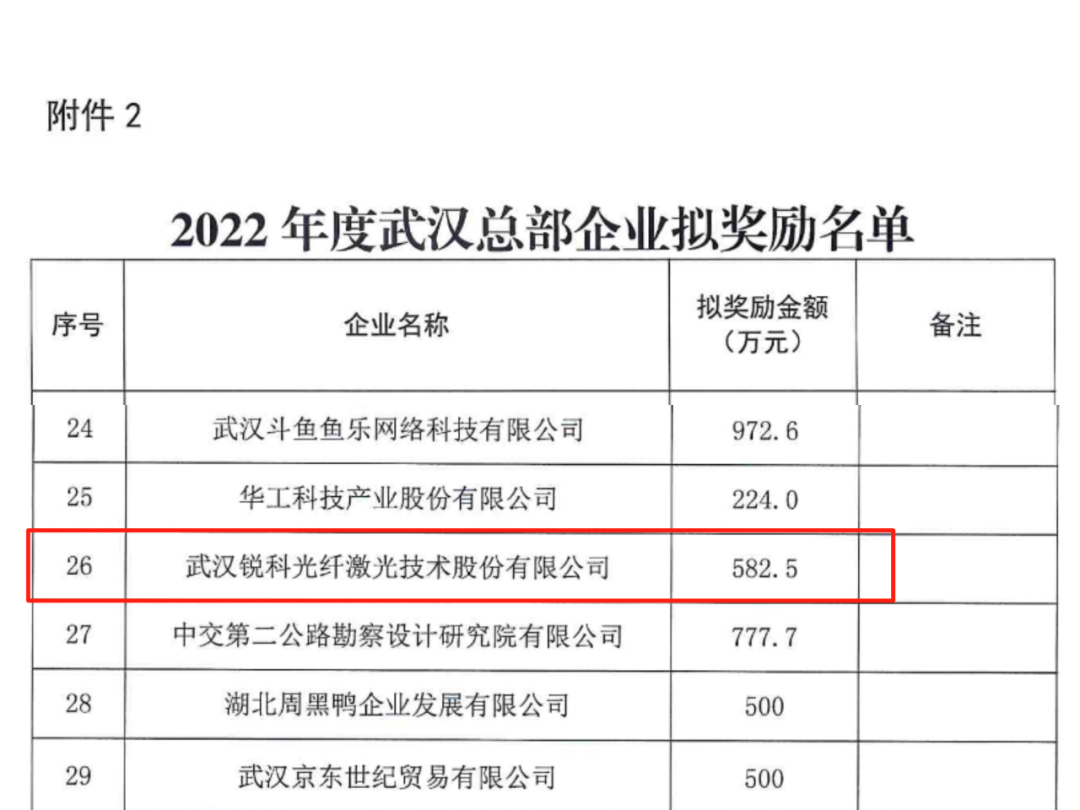 近日,武汉市发展和改革委员会发布《关于2022年度武汉总部企业政策兑现名单的公示通知》,锐科激光进入2022年度武汉总部企业拟奖励名单,获经营贡献奖励及人才奖励达582.5万元。