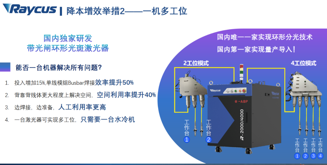 李杰认为,电池、电机和电控占整车成本近50%,降低三电成本能够有效带动下游消费,并推动市场规模扩大。锐科激光通过提升加工速度,一机多工位生产,工艺优化和高效回收四大维度赋能客户降本增效。例如,锐科激光飞行高速焊接技术,在确保焊接精度的同时,保持设备自适应提高;锐科激光推出的首个带光闸双光路环形光斑激光器,可以实现一机多工位、大幅提升空间利用率、人工利用率和焊接效率;锐科激光还通过激光干燥、壳口清洗、激光填丝焊等工艺降低电芯成本;最后在循环利用方面,锐科激光通过激光工艺+机械拆除方式,可将电芯从模组拆除,实现电芯二次利用。