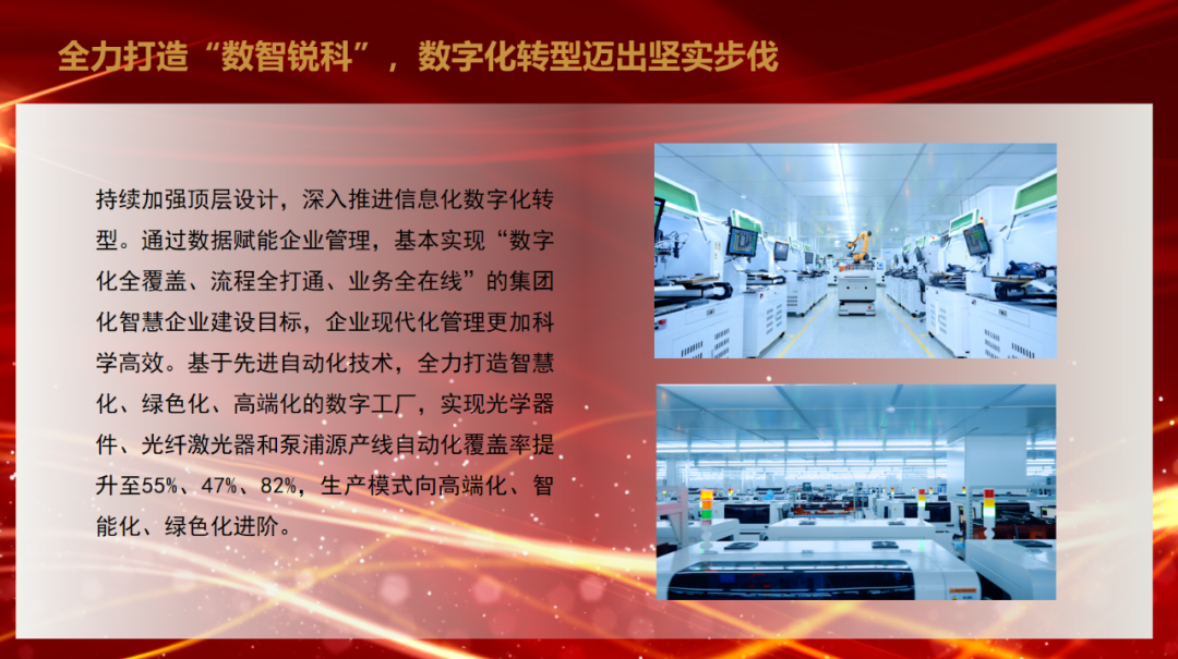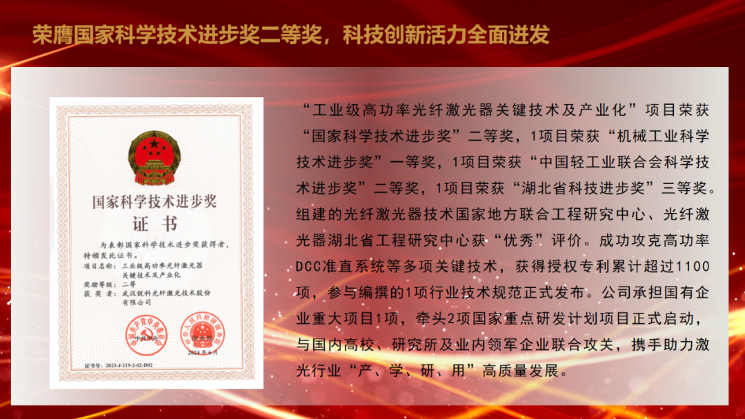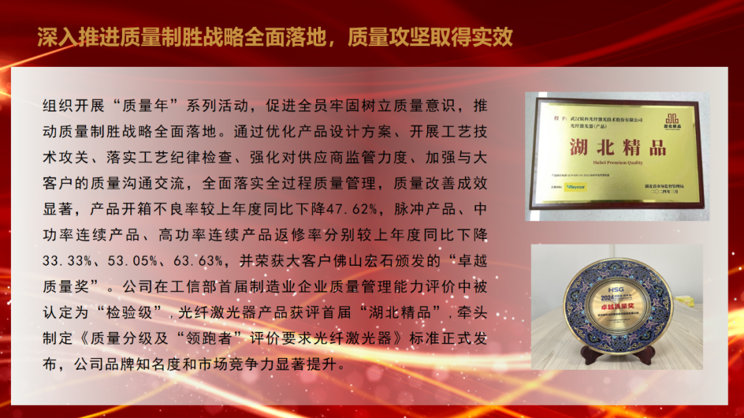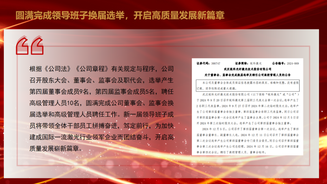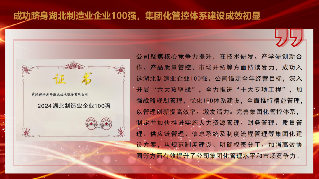 陈正兵指出,2024年是锐科激光实施“十四五”规划的关键一年。一年来,面对外部压力大、内部困难增多的复杂严峻形势,锐科激光坚持以习近平新时代中国特色社会主义思想为指导,全面领会党的二十届三中全会的重大政治意义,在公司党委和董事会的正确指导下,努力实现“坚决打赢六大攻坚战,全力推进十大专项工程”的年度工作目标,加快贯彻落实公司“十四五”总体战略的各项部署,各项工作稳步推进,为建设国际一流激光领军企业奠定了坚实基础。主要表现在巡视巡察整改扎实推进,产业创新成果充分涌现,市场拓展实现稳步增长,稳产保供基础进一步夯实,质量保证能力持续增强,企业规范运作水平持续提升,信息化数字化转型成效明显,经营导向作用发挥实效,人才队伍建设不断夯实,经营管理能力持续提升,风险防控能力显著增强,党建引领作用充分彰显等方面。