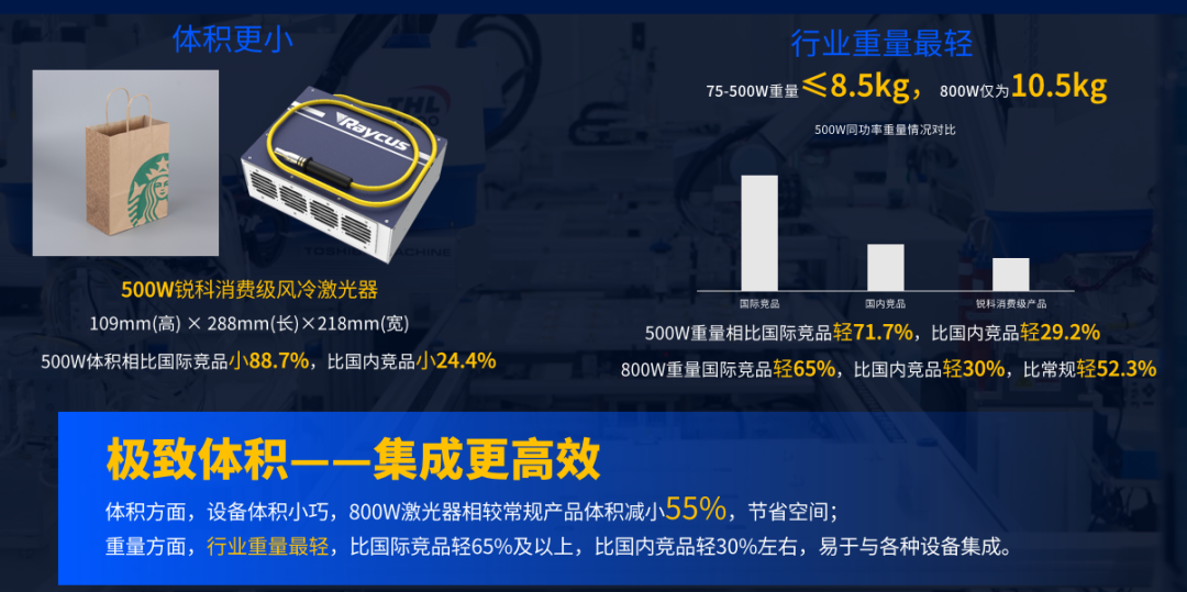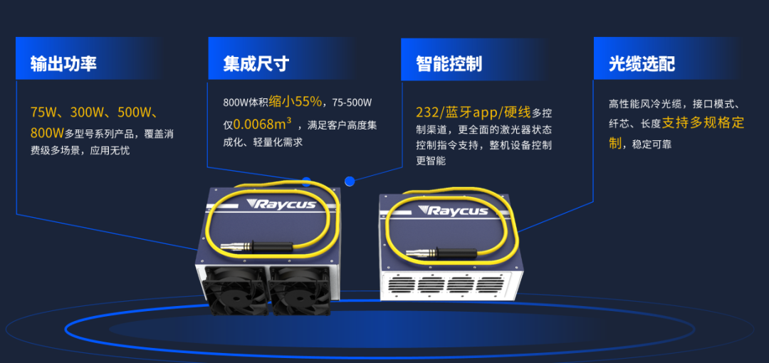 本次发布的消费级风冷激光器系列包含RFL-C75A1、RFL-300A1、RFL-500A1、RFL-800A1四大型号,功率覆盖75W-800W,专为消费制造、创意加工、中小型装备等场景打造。该系列以“轻量化”为核心突破,75-500W机型体积仅0.0068m3,800W机型相较常规产品体积缩小55%;重量方面更创行业新低,75-500W机型≤8.5kg,800W机型仅10.5kg,500W型号相比国际竞品轻71.7%、国内竞品轻29.2%,彻底解决传统设备笨重难集成的痛点。