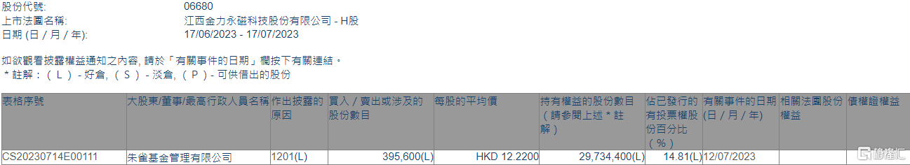 根据联交所最新权益披露资料显示,2023年7月12日,金力永磁(06680.HK)遭朱雀基金管理有限公司在场内以每股均价12.22港元减持39.56万股,涉资约483.42万港元。