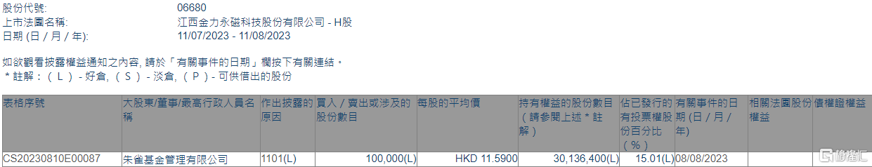 格隆汇8月11日丨根据联交所最新权益披露资料显示,2023年8月8日,金力永磁(06680.HK)获朱雀基金管理有限公司在场内以每股均价11.59港元增持10万股,涉资约115.9万港元。