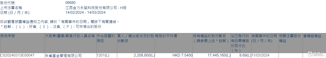 根据联交所最新权益披露资料显示,2024年3月11日,金力永磁(7.62, 0.06, 0.79%)(06680.HK)遭朱雀基金管理有限公司在场内以每股均价7.54港元减持220.88万股,涉资约1665.44万港元。