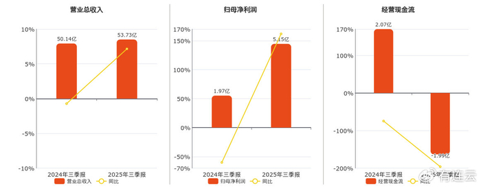 公司营业总收入为53.73亿元。归母净利润为5.15亿元。经营活动现金净流入为-1.99亿元,较去年同报告期经营活动现金净流入减少4.06亿元,同比较去年同期下降196.10%。