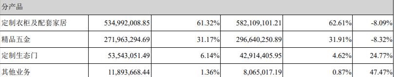 在主营产品中,定制衣柜及配套家居和精品五金是顶固集创的主要收入来源。