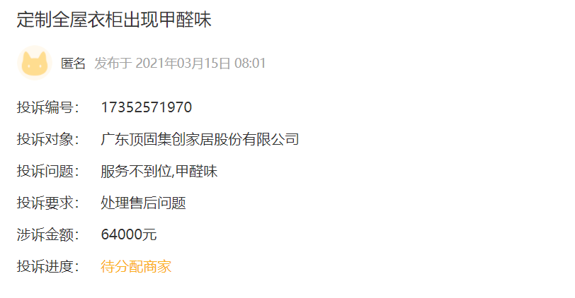 今年3月份,编号为17352571970的消费者在黑猫投诉表示,“2018年10月13日,从广东顶固集创家居股份有限公司定制了64000元衣柜,至今为止衣柜还出现甲醛味,反映多次,投诉多次,至今售后不理睬,一直在敷衍,到现在已经2年多时间了,长期有味道存在,经常闻起来导致头晕呕吐”