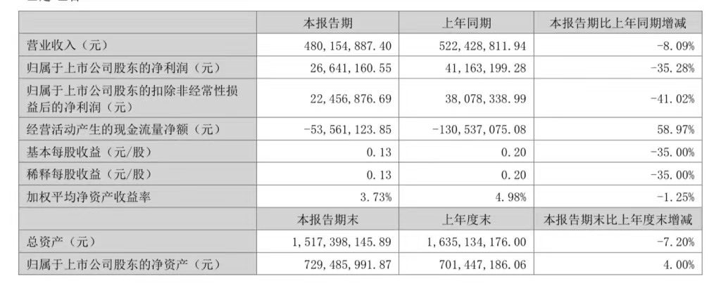 根据公告,公司实现营业收入4.8亿元,同比减少8.09%;归属于上市公司股东的净利润2664.12万元,同比减少35.28%。