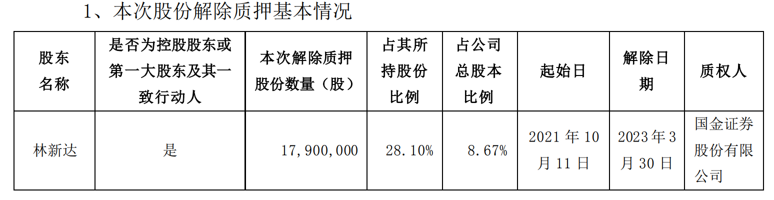 公告显示,顶固集创近日收到公司控股股东、实际控制人林新达的通知,获悉其质押于国金证券股份有限公司的1790万股股份办理了解除质押手续,占顶固集创总股本比例为8.67%。