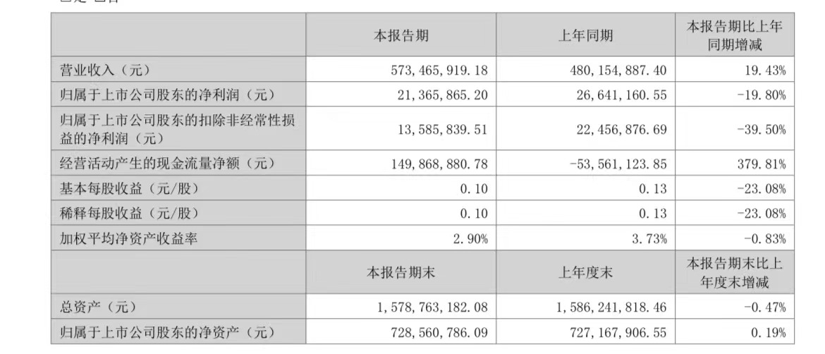 根据公告,公司实现营业收入5.73亿元,同比增长19.43%;归属于上市公司股东的净利润2136.59万元。