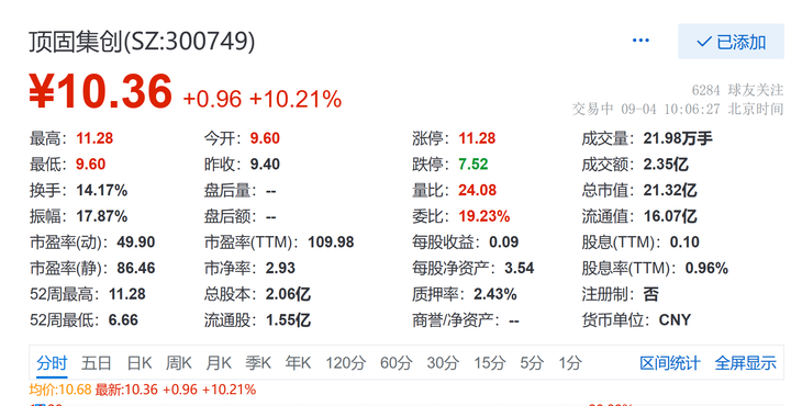 9月4日,顶固集创盘中涨超10%,报10.36元每股,总市值21.32亿元。