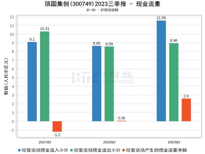 在现金流量方面,顶固集创公司2023年三季度的经营活动产生的现金流量净额为2.6亿元,较上年同期的643.17万元增长了3940.46%。经营活动现金流入小计为11.56亿元,较上年同期的8.65亿元有所增加。经营活动现金流出小计为8.96亿元,较上年同期的8.58亿元有所增加。