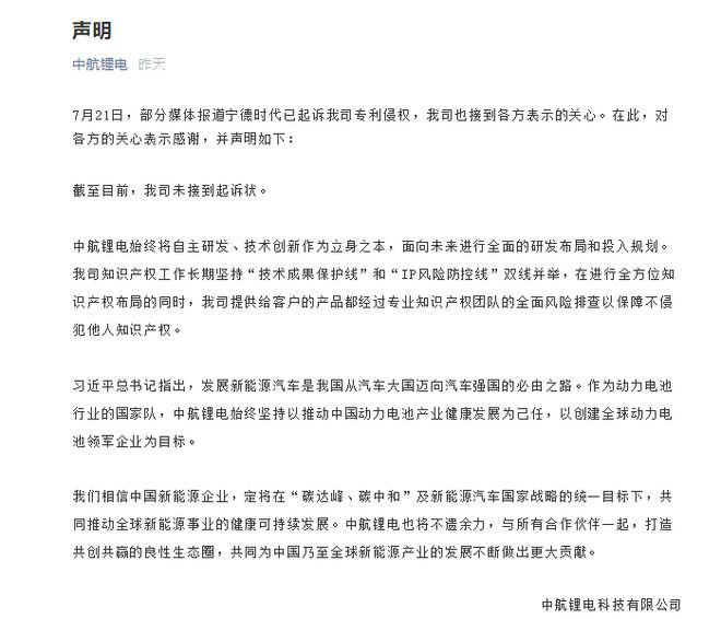 对此,中航锂电方面并不认可。当日晚间,中航锂电公开发表声明称,截至目前,公司未接到起诉状。同时,中航锂电表示,公司始终将自主研发、技术创新作为立身之本,面向未来进行全面的研发布局和投入规划。此外,公司知识产权工作长期坚持“技术成果保护线”和“IP风险防控线”双线并举,在进行全方位知识产权布局的同时,公司提供给客户的产品都经过专业知识产权团队的全面风险排查,以保障不侵犯他人知识产权。