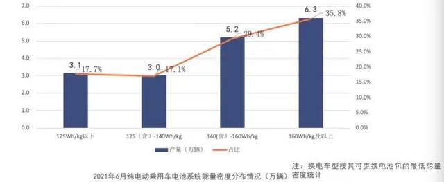 根据动力电池产业创新联盟发布的,今年6月纯电动乘用车电池系统能量密度分布情况来看,超过6成的动力电池能量密度都在140~160Wh/kg,和160Wh/kg以上这个区间。