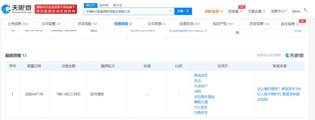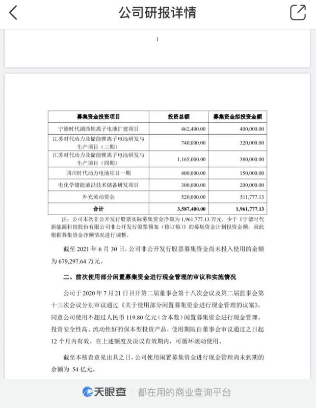 天眼查APP显示,就在去年7月,宁德时代刚进行了一轮融资,总额近200亿。这笔钱,还有近70亿没有花完,为了避免资金的闲置浪费,宁德时代上月宣布,将拿出55亿购买理财产品。