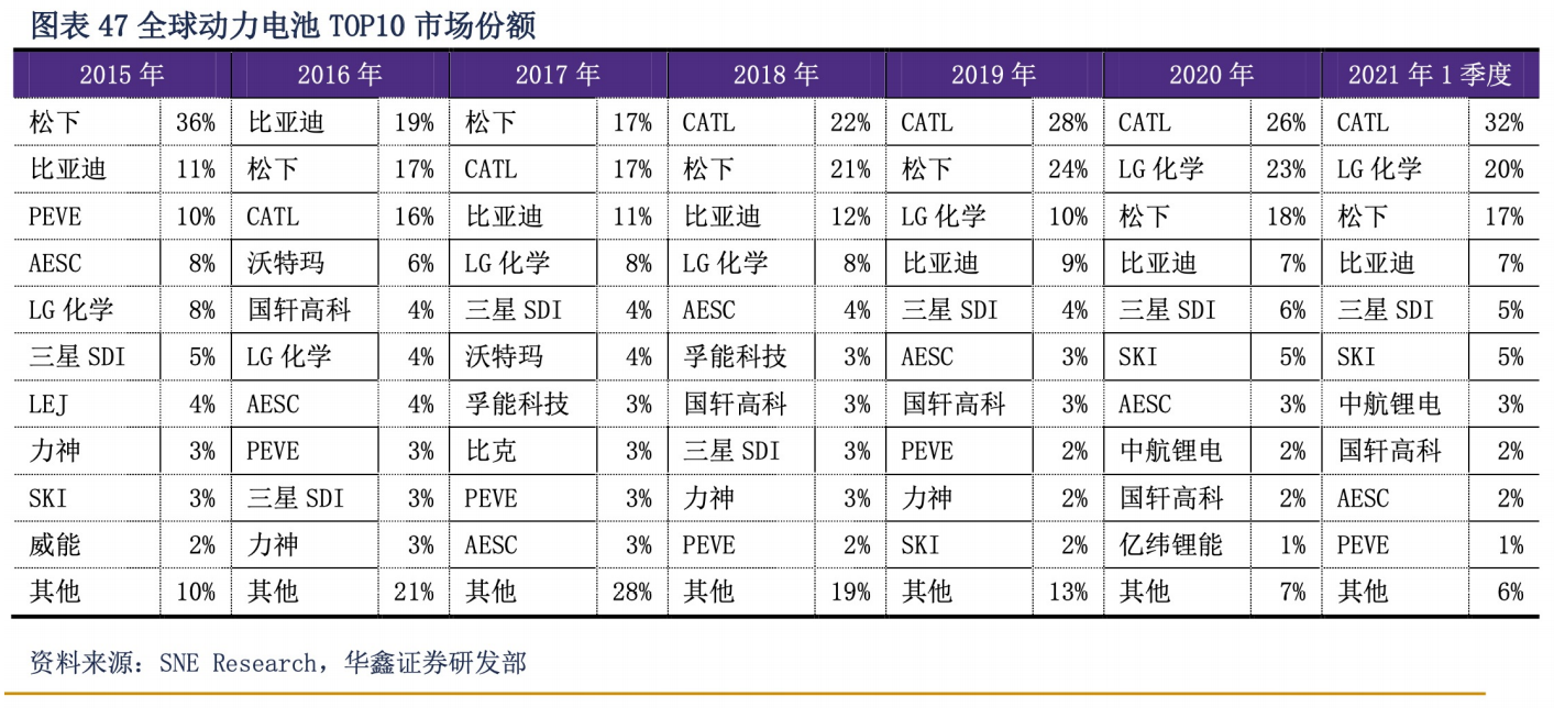 SNE Research的数据显示,2019年、2020年、2021年一季度,宁德时代的全球市场份额为28%、26%和32%。