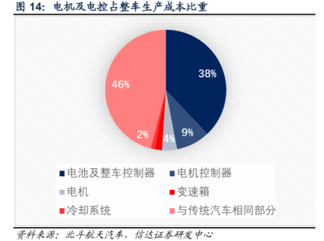 新能源汽车成本占比最高的部分是动力系统,成本占比达到了50%,其中电池占到了整车成本的 38%,电机和电控的占比分别为6.5%和5.5%。