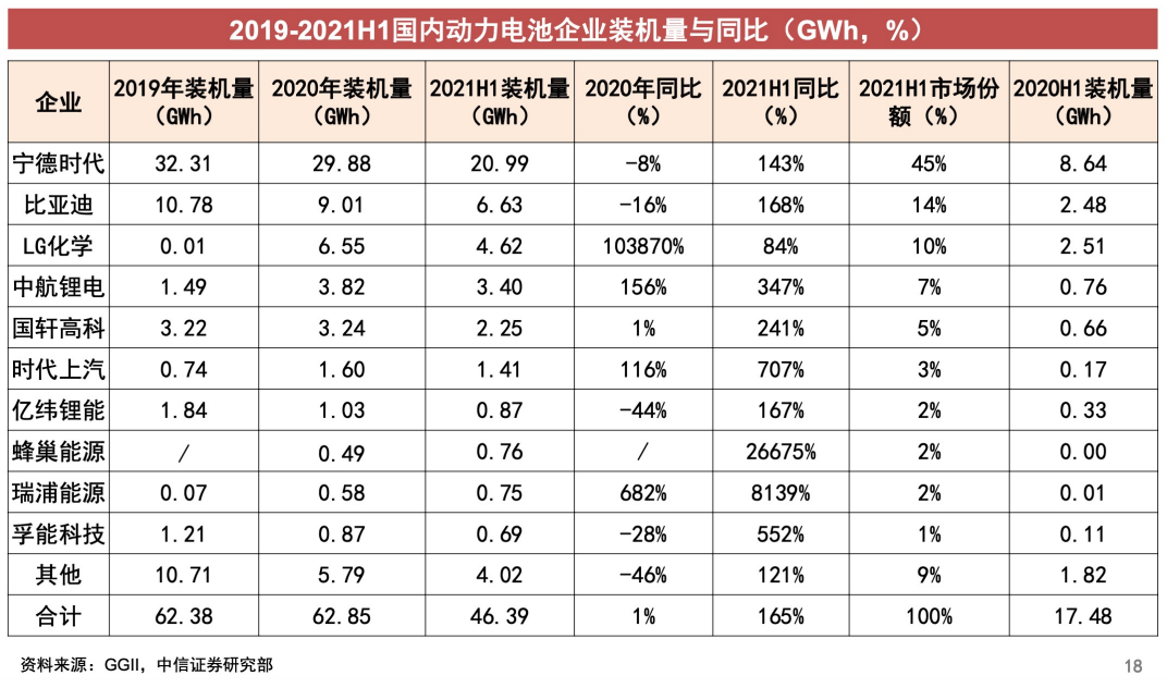 根据GGII的数据,2019年、2020年、2021年上半年,宁德时代国内的市场份额分别为51.8%、47.54%、 45.25%,宁德时代的市场份额均为第一,但市场份额在不断下降。
