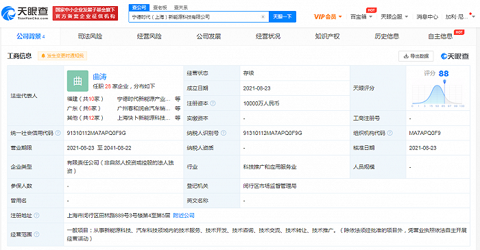 8月23日,宁德时代(上海)新能源科技有限公司成立,法定代表人为曲涛,注册资本1亿人民币,经营范围包括从事新能源科技、汽车科技领域内的技术服务、技术开发、技术咨询、技术交流、技术转让、技术推广。股东信息显示,该公司由宁德时代新能源科技股份有限公司全资控股。