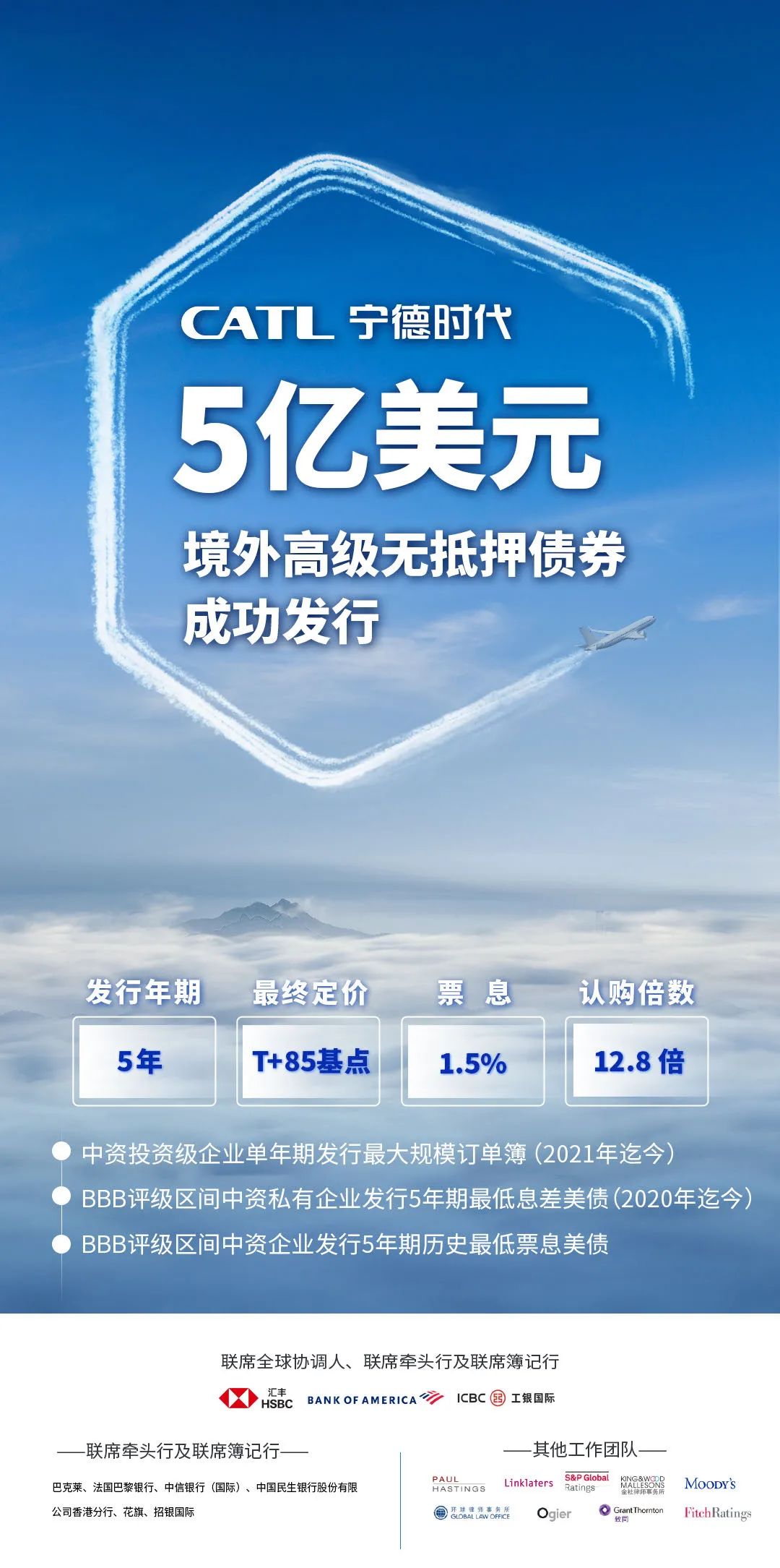 本次发行的主体评级为Baa1/BBB+/BBB+(穆迪/标普/惠誉),5年期发行规模达5亿美元,票息为1.5%。最终定价为T+85基点,较初始价格指引收窄40基点。最终订单簿超过64亿美元,超额认购超过12.8倍。
