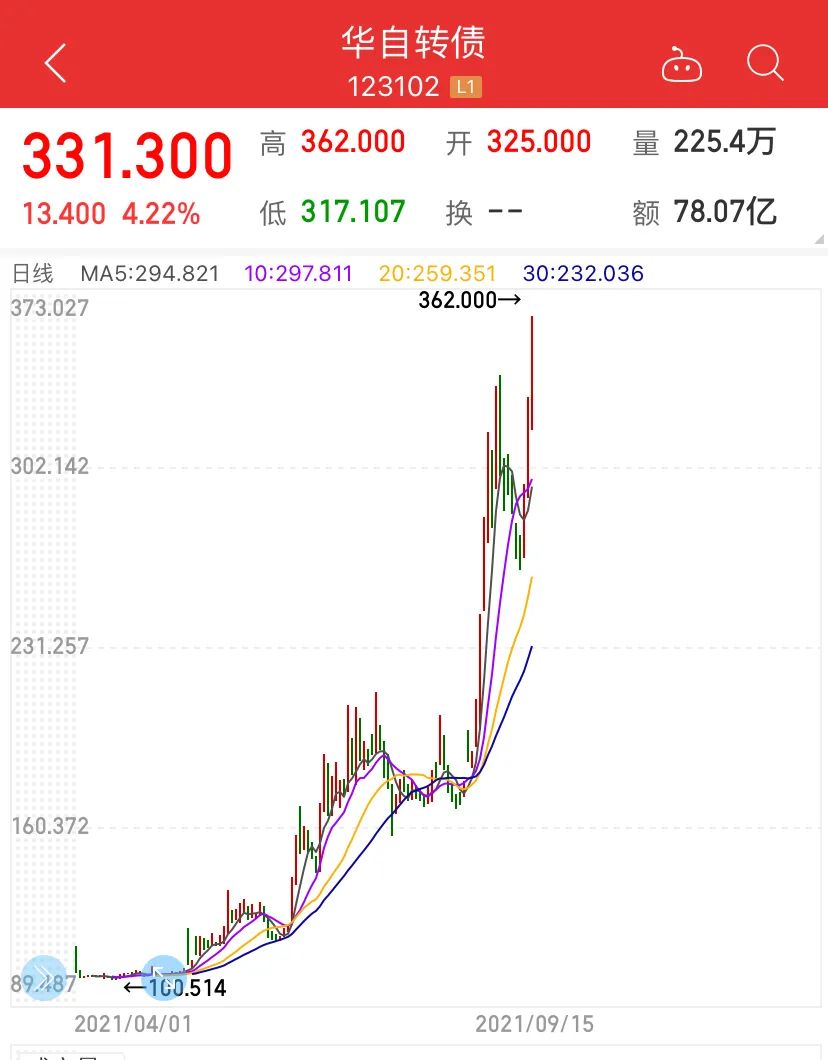 虽然暴涨了3倍,但华自科技最新总市值微84亿元,自由流通市值为46.82亿元。而华自转债的发行金额是6.7亿元,最新转债价格高达331.3元,以此计算转债市值为22.2亿元。并且目前华自转债的转股溢价率为-6.4%。