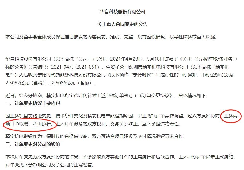 近期大牛股华自科技,9月15日晚间披露重大合同变更公告,近日,全资子公司深圳市精实机电科技有限公司和宁德时代针对前期两项中标订单签订了《订单变更协议》,因上述项目实施地变更、技术条件变化及精实机电产能档期原因,以上两项订单需作调整。经双方友好协商,上述两项订单取消,不再执行。