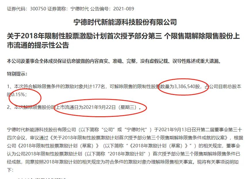 而与华自科技相关的宁德时代,在9月15日晚间也发布公告,于2021年9月22日解除限售股份上市流通。