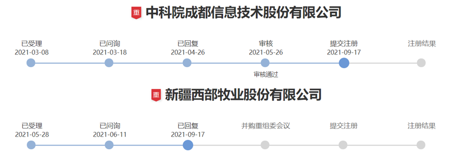 昨日至今重大资产重组新增中科信息1家提交注册企业,新增西部牧业1家回复问询企业。