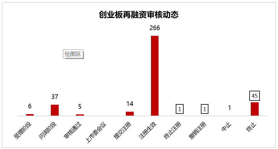 再融资方面,目前处于受理阶段的有6家,问询阶段的有37家,审核通过5家,提交注册14家,注册生效266家,撤销注册1家,终止注册1家,中止1家,终止(撤回)45家,合计376家。