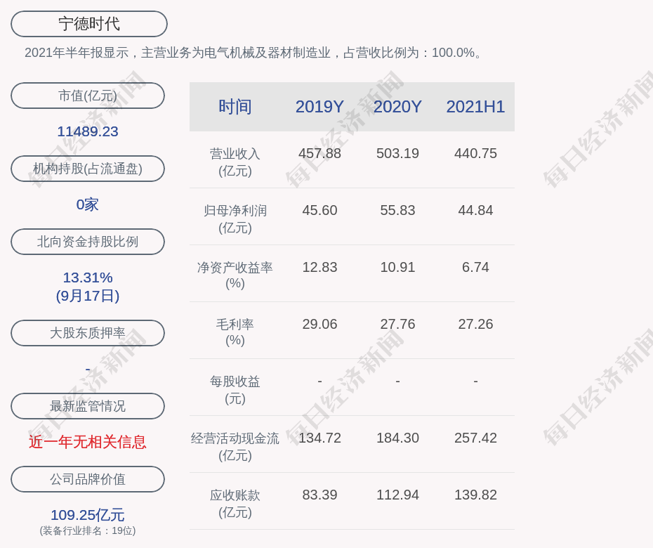 2021年半年报显示,宁德时代的主营业务为电气机械及器材制造业,占营收比例为:100.0%。
