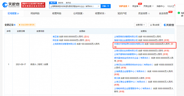 近日,上海国策绿色科技制造私募投资基金合伙企业(有限合伙)发生工商变更,新增股东宁德时代新能源科技股份有限公司等。