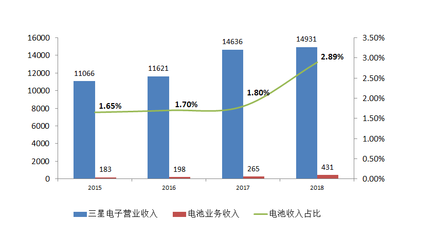 图11:2015年-2018年三星SDI电池收入占比(亿元),资料来源:公司公告