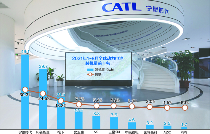 根据SNE Research数据,在今年前8月的全球动力电池装机量排名中,宁德时代居第一,市场份额为30.3%?视觉中国图?刘红梅制图