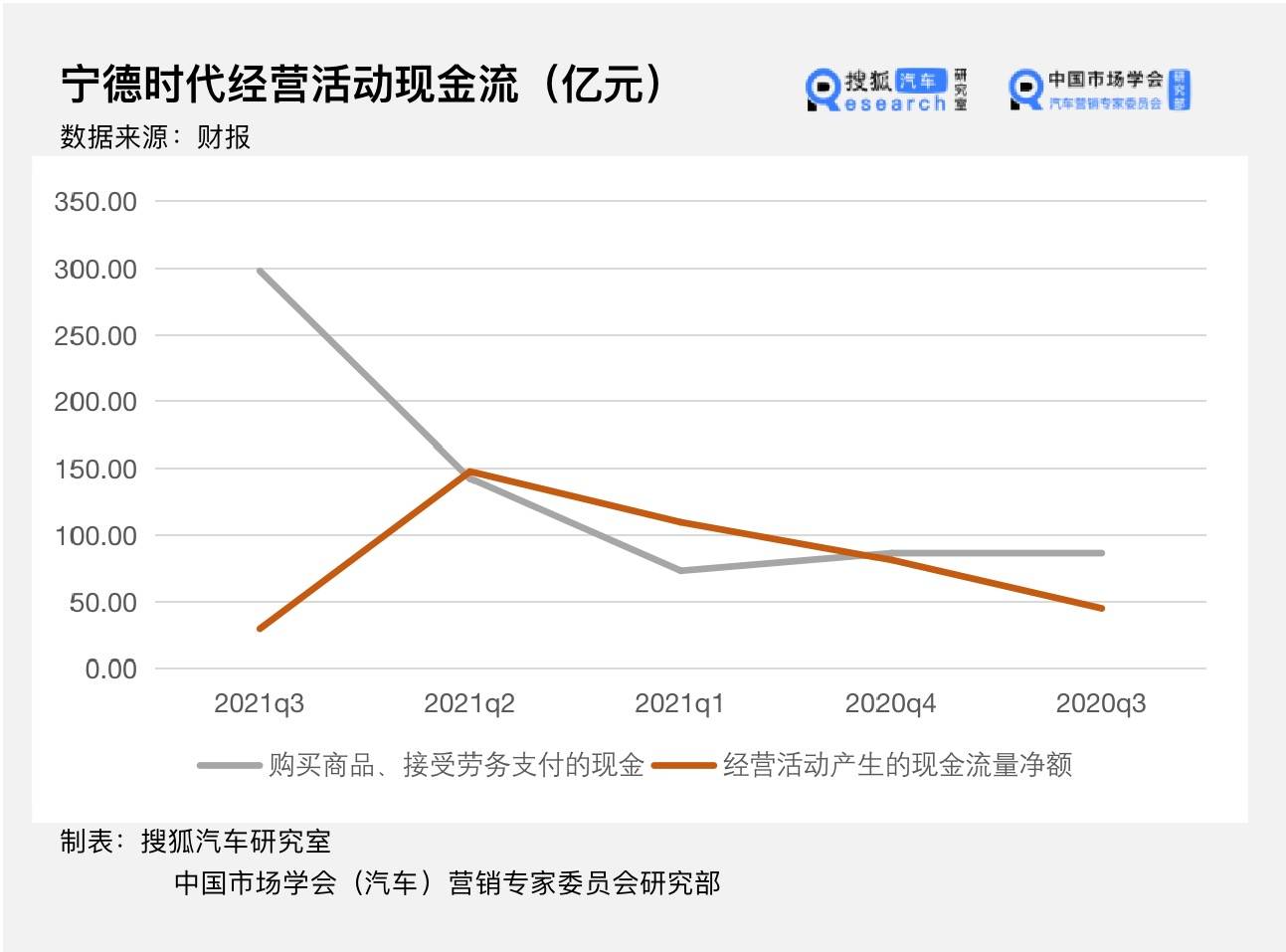 这主要是由于购买商品、接受劳务支付的现金大增,达到298.2亿元,同环比增幅分别为245.38%、109.29%,很可能是宁德时代在为四季度提前锁定部分紧缺的动力电池原材料。