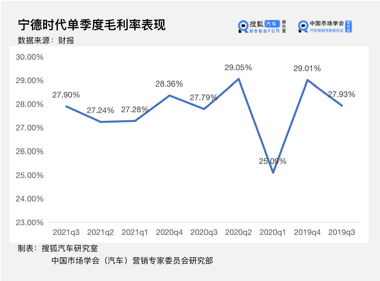 数据显示,宁德时代第三季度毛利率为27.9%,同比去年同期增长了0.11个百分点,环比二季度增长了0.66个百分点。