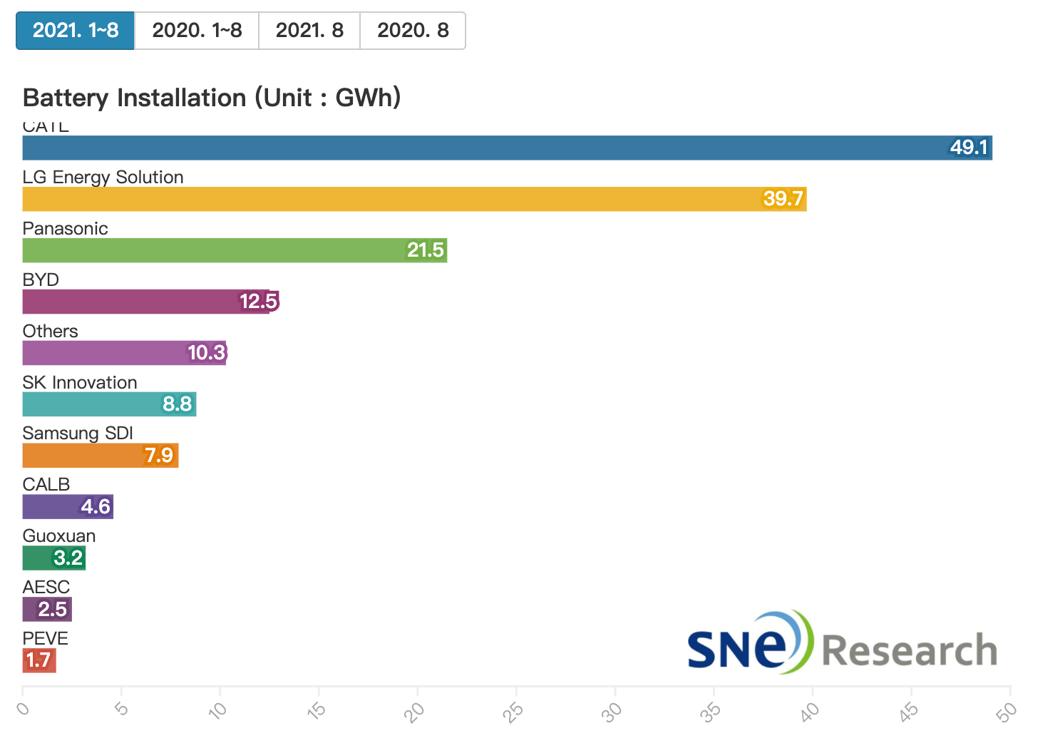 增长直接源于动力电池装机量的上升。根据韩国研究机构SNE Research的最新数据,1-8月,宁德时代电池装机量持续领先,达49.1 GWh——这一数字是LG化学的1.2倍、松下的2.3倍。