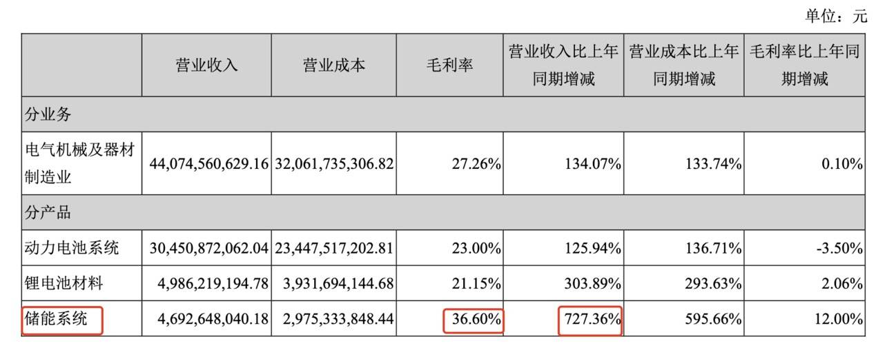 根据更早发布的半年报,储能系统是宁德时代今年上半年的最大亮点。其储能系统上半年销售收入46.93亿元,同比增长727.36%,占宁德时代整体业务的比重提升至10%;毛利率达36.6%,相比去年同期增长12个百分点。相较之下,动力电池业务同期的毛利率为23%,同比出现3.5个百分点的下滑。