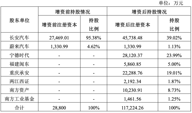 具体来看,长安汽车增资5亿元,宁德时代拟增资7.7亿元,福建闽东拟增资1.6亿元,重庆承安拟增资6.1亿元,两江西证拟增资6000万元,南方资产拟增资2.8亿元,南方工业基金拟增资4000万元。