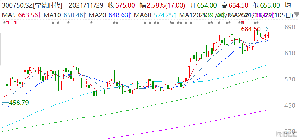 宁德时代(300750.SZ)涨超3%,盘中创历史新高价684.5元,市值1.59万亿元。