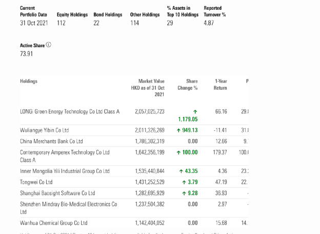与安联神州A股基金形成鲜明对照,摩根大通旗下旗舰中国基金“摩根基金-中国A股机遇基金I(累计)-港元(JPMorgan Funds - China A-Share Opportunities Fund I (acc)– HKD)10月大手笔加仓。其中,加仓宁德时代幅度高达100%,加仓五粮液949.13%,加仓隆基股份更是高达1179.05%。此外,基金还加仓了伊利股份43.35%。