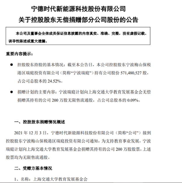 12月3日晚间,宁德时代发布《关于控股股东无偿捐赠部分公司股份的公告》,称接到控股股东宁波梅山保税港区瑞庭投资有限公司通知,为支持教育事业发展,宁波瑞庭计划向上海交通大学教育发展基金会无偿捐赠其持有的公司200万股股票,占宁德时代总股本0.09%。