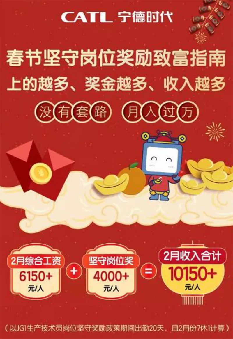 近日,“电池茅”宁德时代在官方招聘账号“CATL工人招聘中心”发布其春节坚守岗位奖励政策,并将其称为“致富指南”,表示“上的越多、奖金越多、收入越多”。