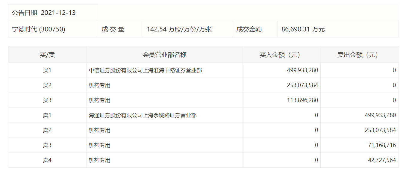 宁德时代今日出现8.669亿元大宗交易,成交142.54万股,成交买卖方均出现机构席位