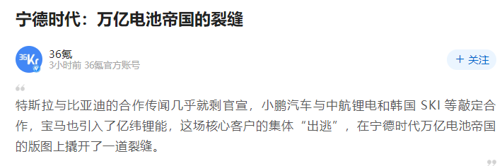 文章开篇就指出,“这场核心客户的集体‘出逃’,在宁德时代万亿电池帝国的版图上撬开了一道裂缝。”