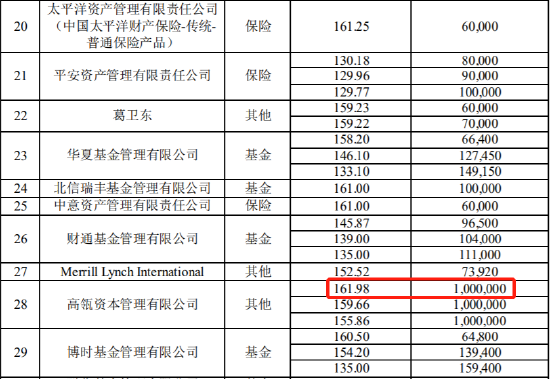 值得注意的是,本次报出“159.23元/股”、“159.22元/股”的葛卫东也被淘汰了,而高瓴资本报出的三个价格,有一个为161.98元,认购金额高达100亿元,可谓赚的彭满钵满,收益率高达3倍多。